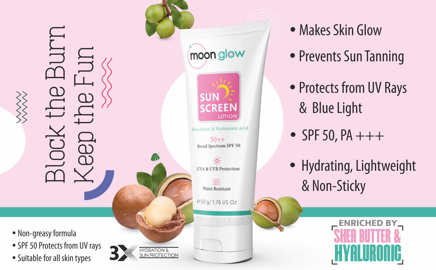 - Moon Glow Shea Butter and Hyaluronic Acid Broad spectrum SPF 50++ is ideal for oily and acne-prone skin. It effectively protects the skin from sun damage without leaving a patchy or whitish appearance after application.