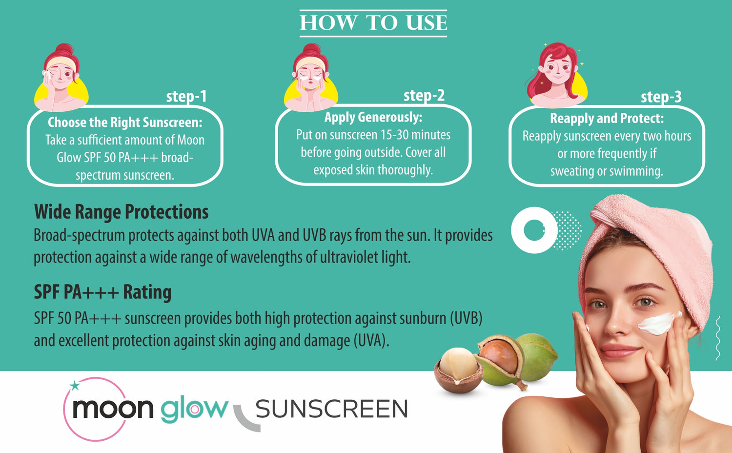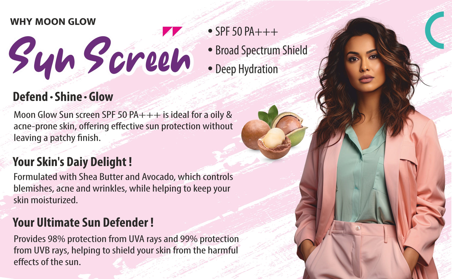 - Moon Glow sunscreen Broad spectrum SPF 50 PA+++ sunscreen, you can help shield your skin from the sun's harmful effects while maintaining a matte or non-greasy finish. Remember to apply an adequate amount of sunscreen and reapply as recommended for optimal protection throughout the day.