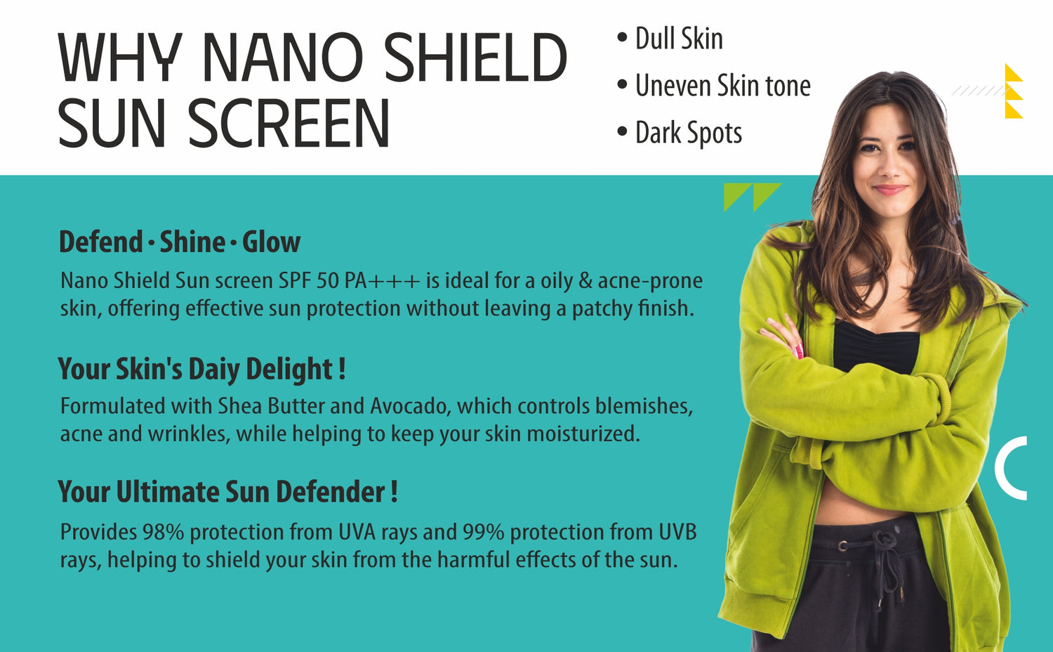 Nano Shield Technology: The term "nano shield" suggests the use of Advance technology to create a protective barrier on the skin's surface. This technology enhance the effectiveness and durability of the sunscreen with other ingredients.